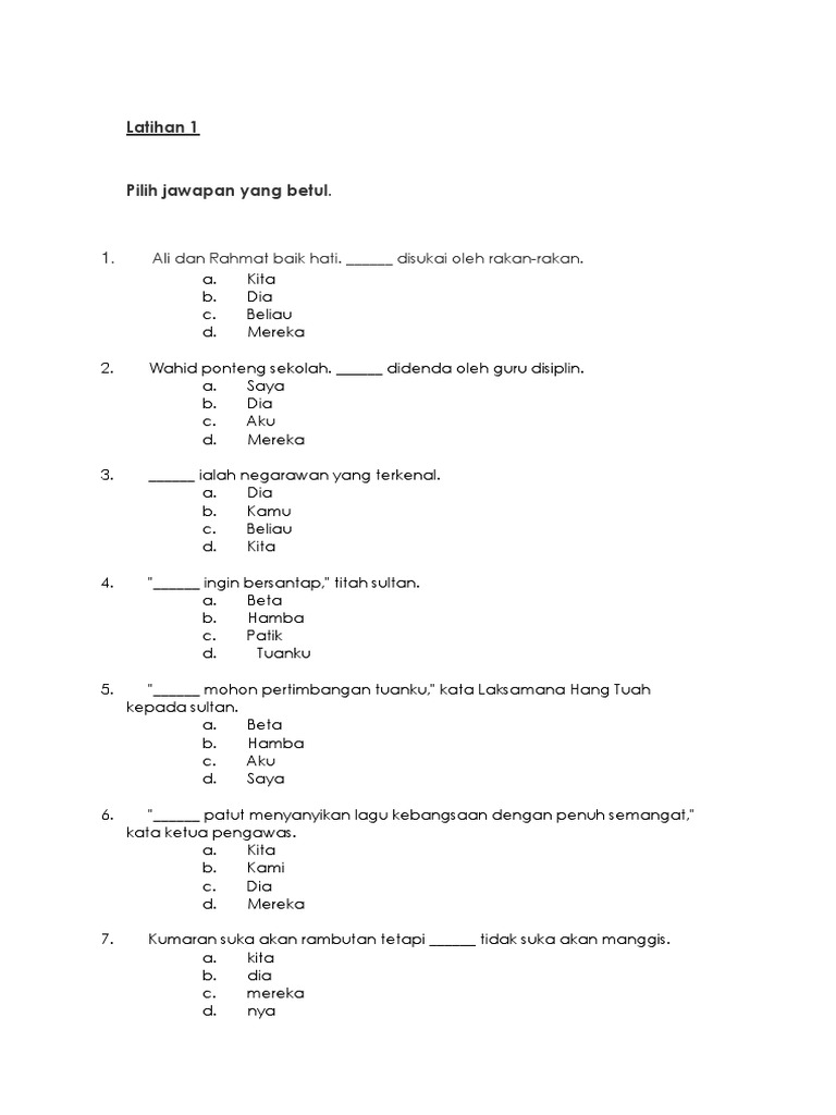 Kata Ganti Nama Diri Latihan 1 Pilihan Objektif Pdf